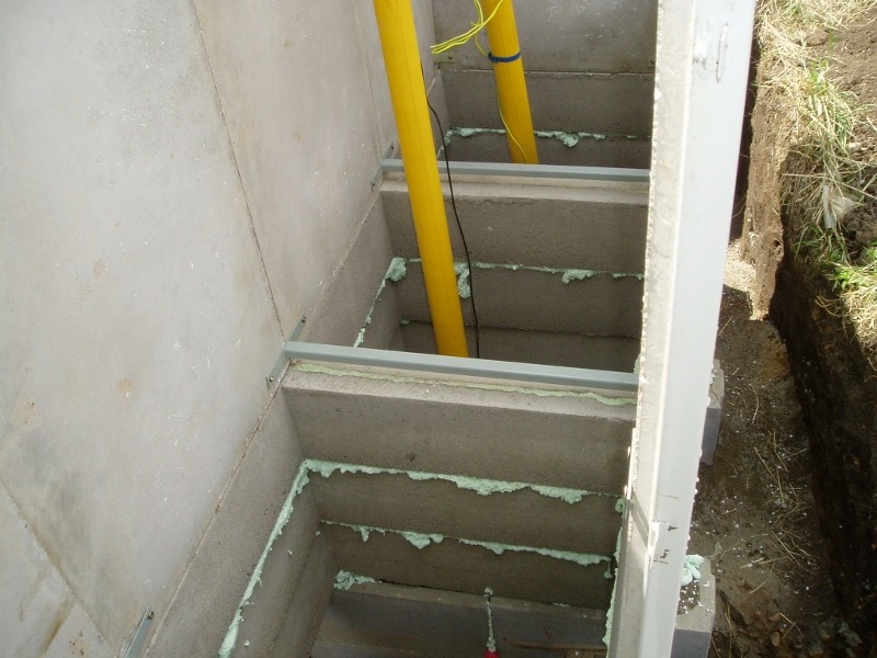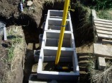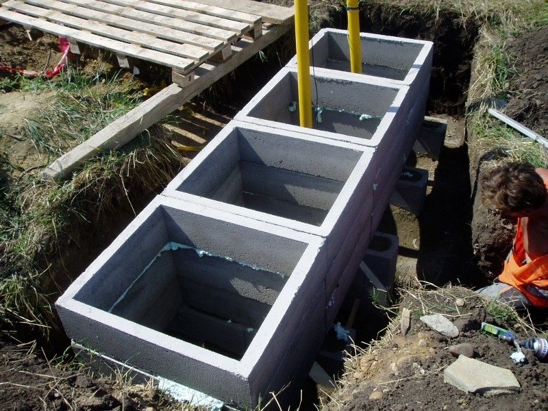 - Základ:dílce výšky 20 cm – základové věnce ve třech vrstvách osazené kratší stranou na bednících tvárnicích vyplněných betonem